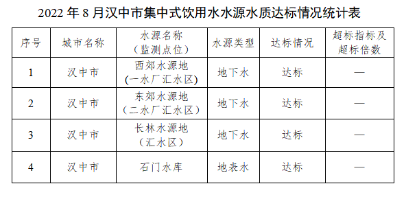 2022年8月,365bet官网平台网址_国内365bet登录网址_bt365网址监测了市中心城区东郊、西郊、长林、石门水库4个在用集中式生活饮用水水源地水质,市中心城区东郊、西郊、长林水源地为地下水,石门水库水源地为地表水。