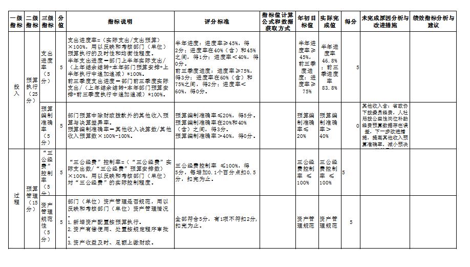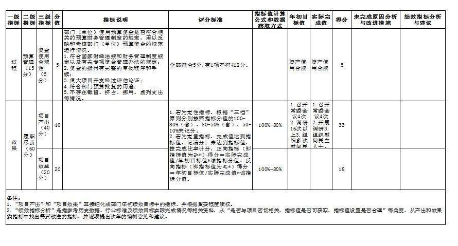 自评得分:80 (一)简要概述部门职能与职责。 政协陕西省365bet官网平台网址_国内365bet登录网址_bt365网址委员会办公室承担政协汉中委员会履行政治协商、民主监督、参政议政职能的各项服务保障工作。其主要职责: 1、负责政协365bet官网平台网址_国内365bet登录网址_bt365网址委员会全体会议、常务委员会议、主席会议、秘书长会议以及其他重要会议、活动的组织和服务工作。 2、负责政协365bet官网平台网址_国内365bet登录网址_bt365网址委员会全体会议、常务委员会会议、主席会议决议、决定的具体组织实施工作。 3、负责起草、审核处理市政协重要文稿;负责市政协机关日常文书的处理工作。 4、负责协调、保障专门委员会实施专题调研计划和开展相关活动的组织服务工作。 5、协调和组织人民政协的对内外宣传工作;收集反应社情民意,处理政协委员和人民群众的来信来访。 6、负责与中共365bet官网平台网址_国内365bet登录网址_bt365网址委、市人大、市政府有关部门工作联系,指导县(区)政协干部培训工作;负责与市级各民主党派、工商联的联系协调工作。 7、负责市政协机关的机构编制、人事和劳资管理工作。 8、负责市政协机关的后勤保障及接待、机关建设规划及组织实施、安全和社会治安综合治理以及精神文明建设。 9、负责市政协机关离退休人员政治生活待遇的落实和有关活动的组织安排。 10、负责市政协机关无计划、固定资产、市政协机关房地产权的管理工作。 11、承办领导交办的其它工作。 (二)简要概述部门支出情况,按活动内容分类。 涉及一般公共预算当年财政拨款收入1610.44万元,上年一般公共预算结余16.44万元,本年一般公共预算财政拨款支出1355.48万元,本年一般公共预算财政拨款结余271.4万元。当年财政拨款支出1355.48万元包含基本支出901.08万元(其中人员经费支出767.73万元,公用经费支出133.35万元),本年专项业务资金包含:1.政协365bet官网平台网址_国内365bet登录网址_bt365网址五届四次会议专项经费90万元。2、主席工作经费20万,3、政协委员活动经费64万,4、水邮经费补助2万,5、业务费18.1万,6、保安/保洁劳务费26万,7、驻纪检监察组工作经费5万,8、慰问民主人士经费6万,9、常委会工作经费18万,10、维修300万,11、集中供热工程77.2万) (三)简要概述当年市委市政府下达的重点工作。 2020年,市政协工作的任务及目标是:坚持以习近平新时代中国特色社会主义思想为指引,持续深入学习贯彻党的十九大、十九届四中全会和中央政协工作会议精神,认真践行习近平总书记关于加强和改进人民政协工作的重要思想,全面落实《中共中央关于新时代加强和改进人民政协工作的意见》,以贯彻落实市委五届九次全会作出的决策部署为主线,以充分发挥专门协商机构作用为目标,以推进建言资政和凝聚共识双向发力为重点,以实现履职工作提质增效为根本,以强化自身建设为保障,紧紧围绕全市实施“六个三”战略部署、打造“三个六”重点支撑、培育发展“四个在汉中”增长新动能工作大局,加强思想政治引领,发挥协商民主优势,全面推动履职工作提质增效,为助推新时代追赶超越、高质量建设“三市”广泛凝聚人心、汇聚强大合力。 一级 指标 二级 指标 三级指标 分值 指标说明 评分标准 指标值计算公式和数据获取方式 年初目标值 实际完成值 得分 未完成原因分析与改进措施 绩效指标分析与建议 投 入 预算执行(25分) 预算 完成率 (10分) 10 预算完成率=(预算完成数/预算数)×100%,用以反映和考核部门(单位)预算完成程度。 预算完成数:部门(单位)本年度实际完成的预算数。 预算数:财政部门批复的本年度部门(单位)预算数。 预算完成率=100%的,得10分。 预算完成率≥95%的,得9分。 预算完成率在90%(含)和95%之间,得8分。 预算完成率在85%(含)和90%之间,得7分。 预算完成率在80%(含)和85%之间,得6分。 预算完成率在70%(含)和80%之间,得4分。 预算完成率<70%的,得0分。 预算完成率=(预算完成数/预算数)×100% 获取方式:财政云预算执行。 1 100% 10 预算调整率 (5分) 5 预算调整率=(预算调整数/预算数)×100%,用以反映和考核部门(单位)预算的调整程度。 预算调整数:部门(单位)在本年度内涉及预算的追加、追减或结构调整的资金总和(因落实国家政策、发生不可抗力、上级部门或本级党委政府临时交办而产生的调整除外)。 预算包括一般公共预算与政府性基金预算。 预算调整率绝对值≤5%,得5分。 预算调整率绝对值>5%的,每增加0.1个百分点扣0.1分,扣完为止。 预算调整率=(预算调整数/预算数)×100% 预算调整率小于等于5% 53% 0 主要原因:1、为保障机关办公用房在符合制度规定要求下,均匀分配充分使用,追加西侧办公楼维修改造专项经费;2、为保障机关干部良好办公环境,追加集中供热工程改造专项经费。改进措施:增强预算前瞻性,加强资金管理,按工程量及时支付到位。