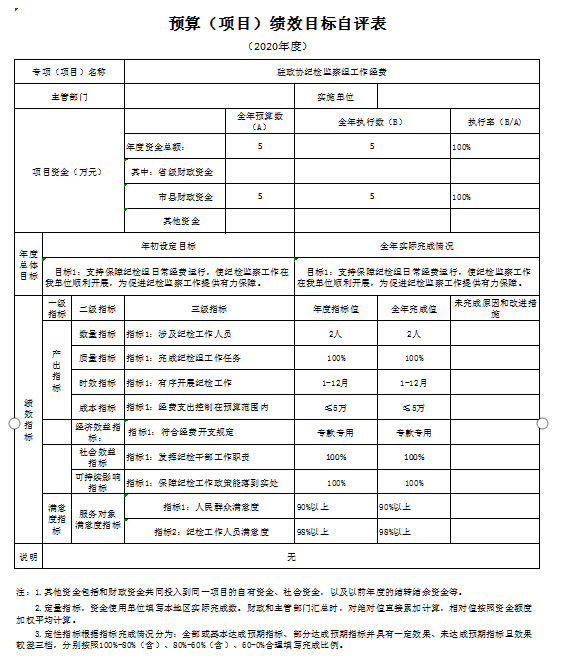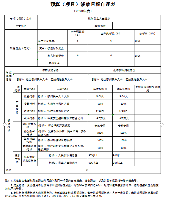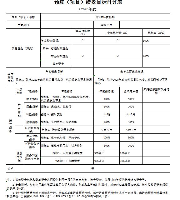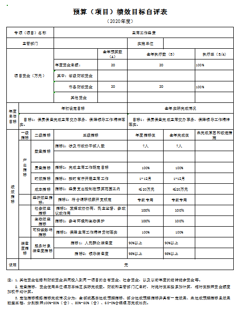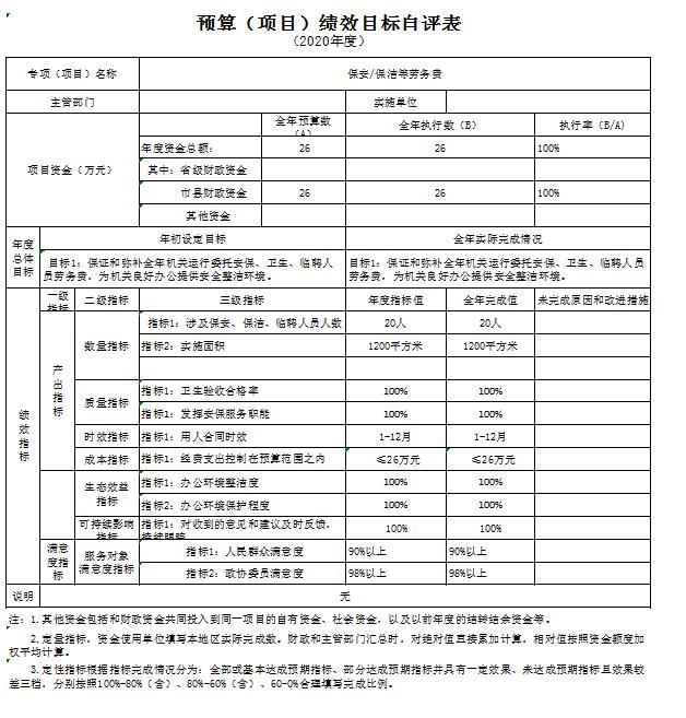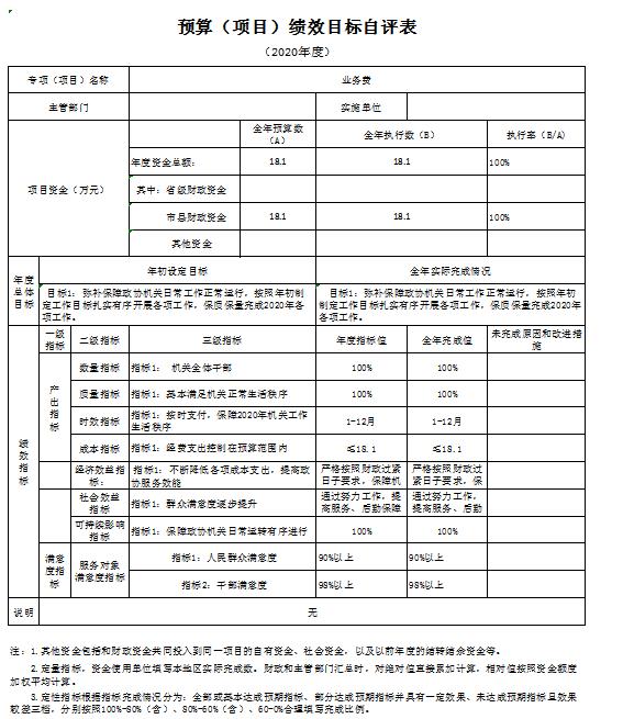根据部门整体支出绩效自评指标体系,本部门自评得分80分。部门整体支出全年预算数961.89万元(含政协会议90万元),执行数1355.48万元,完成预算的140.92%。执行数大于预算数的主要原因是:2020年中根据机关实际情况申请财政下拨西侧办公楼维修改造工程300万和集中供热工程77.2万元并发生相应支出。本年度部门总体运行情况及取得的成绩:2020年度机关日常运转上能够严格执行中央八项规定,厉行节约,减少不必要的开支。发现的问题及原因:1、2020年预算完成率较低,主要原因是:本年度进行西侧办公楼维修改造,因跨年度项目,无法一次支付工程款,按照合同要求只按照施工进度支付部分资金,剩余资金待下年度支付;2、集中供热工程改造下达资金77.2万元,工程于2020年11月完工,根据合同要求,保留9.92万元质保金,待质保期结束无工程质量问题后进行支付。3、三公经费控制率较低,是因为机关公务车辆购置使用年限较久,维修次数频繁,在有公车空编的条件下按照财政制度要求购置公务用车一辆,导致三公经费超支。下一步改进措施:强化财政资金预算,规范资金分配,加强财政资金有效管理,厉行节约,提高资金使用率,更高标准完成财政资金预算绩效执行。 部门整体支出绩效自评表 (2020年度) 填报单位:365bet官网平台网址_国内365bet登录网址_bt365网址政协