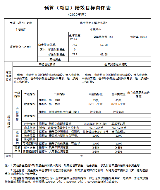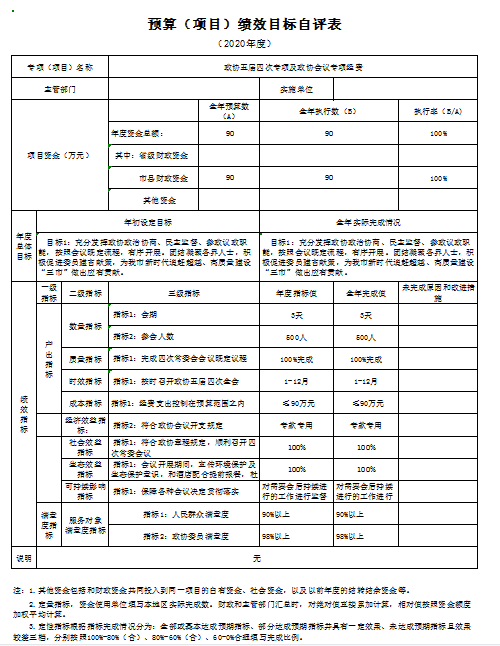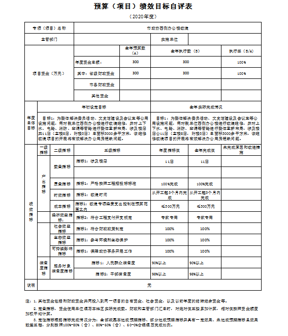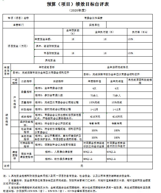 0 辆,机要通信用车 4 辆,应急保障用车 0 辆,执法执勤用车0 辆,特种专业技术用车0辆,离退休干部用车0辆,其他用车1辆。单价50万元以上的通用设备0台(套);单价100万元以上的专用设备0台(套)。2020年当年购置车辆 1 辆;购置单价50万元以上的通用设备0台(套);购置单价100万元以上的专用设备0台(套)。 十三、预算绩效情况说明 (一)预算绩效管理工作开展情况说明。 根据预算绩效管理要求,本部门组织对 2020年一般公共预算项目支出全面开展绩效自评,共有项目10个,涉及资金549.1 万元,占一般公共预算项目支出总额的 141.85 %。组织对2020年 1 个政府性基金预算项目支出开展绩效自评,共涉及资金 77.2 万元,占政府性基金预算项目支出总额的114.74%。 (二)部门决算中项目绩效自评结果。 本部门在市级部门一般公共预算项目决算中反映保安保洁劳务费、常委会工作经费等10个一级及集中供热工程改造政府性基金项目绩效自评结果。 一般公共预算项目绩效自评综述:项目全年预算数549.10万元,执行数324.64万元,占一般公共预算项目支出总额的 83.86 %。绩效项目包括: (1)保安保洁劳务费,全年预算数26.00万元,执行数26.00万元,用于保障和弥补机关运行委托保安、卫生,临聘人员劳务费,提高良好办公环境; (2)常委会工作经费,全年预算数18.00万元,执行数18.00万元,用于保障完成市政协全年四次常委会议顺利召开; (3)水/邮经费补助,全年预算数2.00万元,执行数2.00万元,用于弥补全年机关日常水费/机关通讯费不足情况; (4)业务费,全年预算数18.10万元,执行数17.65万元,用于弥补机关日常工作正常运转,保质保量完成全年各项工作任务; (5)驻政协纪检监察组工作经费,全年预算数5.00万元,执行数5.00万元,用于支持保障纪检组日常开展工作,为纪检监察工作提供有力保障; (6)慰问民主人士经费,全年预算数6.00万元,执行数6.00万元,用于走访慰问民主人士,团结促进各界人士; (7)政协委员活动经费,全年预算数64.00万元,执行数64.00万元,用于完成全年既定走访调研视察活动,为政协履职提供有力保障; (8)主席工作经费,全年预算数20.00万元,执行数19.17万元,用于保质保量完成主席交办事务,保障领导工作精神落实落细; (9)政协五届四次专项及政协会议专项经费,全年预算数90.00万元,执行数76.92万元,用于组织召开政协五届会议,充分发挥政治协商、参政议政职能,按照会议既定流程有序开展,为我市高质量建设“三市”做出应有贡献; (10)市政协西侧办公楼改造,全年预算数300.00万元,执行数89.90万,用于整体解决委员活动、文史馆建设及会议室等公用设施问题,对我单位西侧办公楼进行改造维修,并对上下水、电路、消防、空调等管路进行整体重新布局,有效解决机关办公用房短缺问题。 项目绩效未达到100%的主要原因是:2020年西侧办公楼维修改造工程于年底开工,属跨年度工程项目,按照合同要求根据施工进度支付相应款项,剩余未支付款项于次年根据施工进度进行支付,故年底结余资金210.10万元。通过项目实施,发现的问题及原因:今年以来,我单位能够较好完成全年预算,但在创新业务开展方面存在预算不到位情况,降低了财政预算执行率。下一步改进措施:我单位将加强相关部门业务往来,继续科学预算,厉行节约,高标准完成项目绩效任务。 2.集中供热工程项目绩效自评综述:项目全年预算数77.20万元,执行数67.28万元,完成预算的87.15 %。用于通过市政协办公区域改造建设,接入市政集中供热工程,在冬季供暖前达到供热需求,进一步提升机关干部工作环境。项目绩效未达到100%的主要原因是:集中供热工程改造项目于2020年11月竣工,已支付工程款项67.28万元,剩余9.92元为工程质保金,待一年质保期结束无特殊情况支付剩余款项。 (三)部门整体支出绩效自评结果。